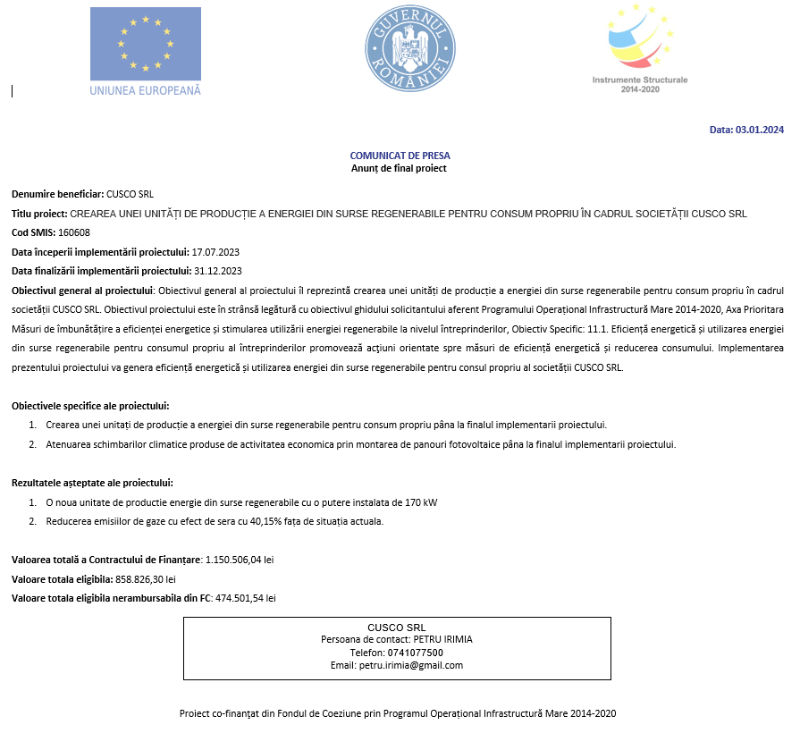 Dorinta de a pastra cele mai ridicate standarde in cadrul activitatii desfasurate de CUSCO S.R.L., a determinat implementarea unui sistem de Management al Calitatii, auditat si inregistrat de catre CertRom conform standardului SR EN ISO 9001:2008